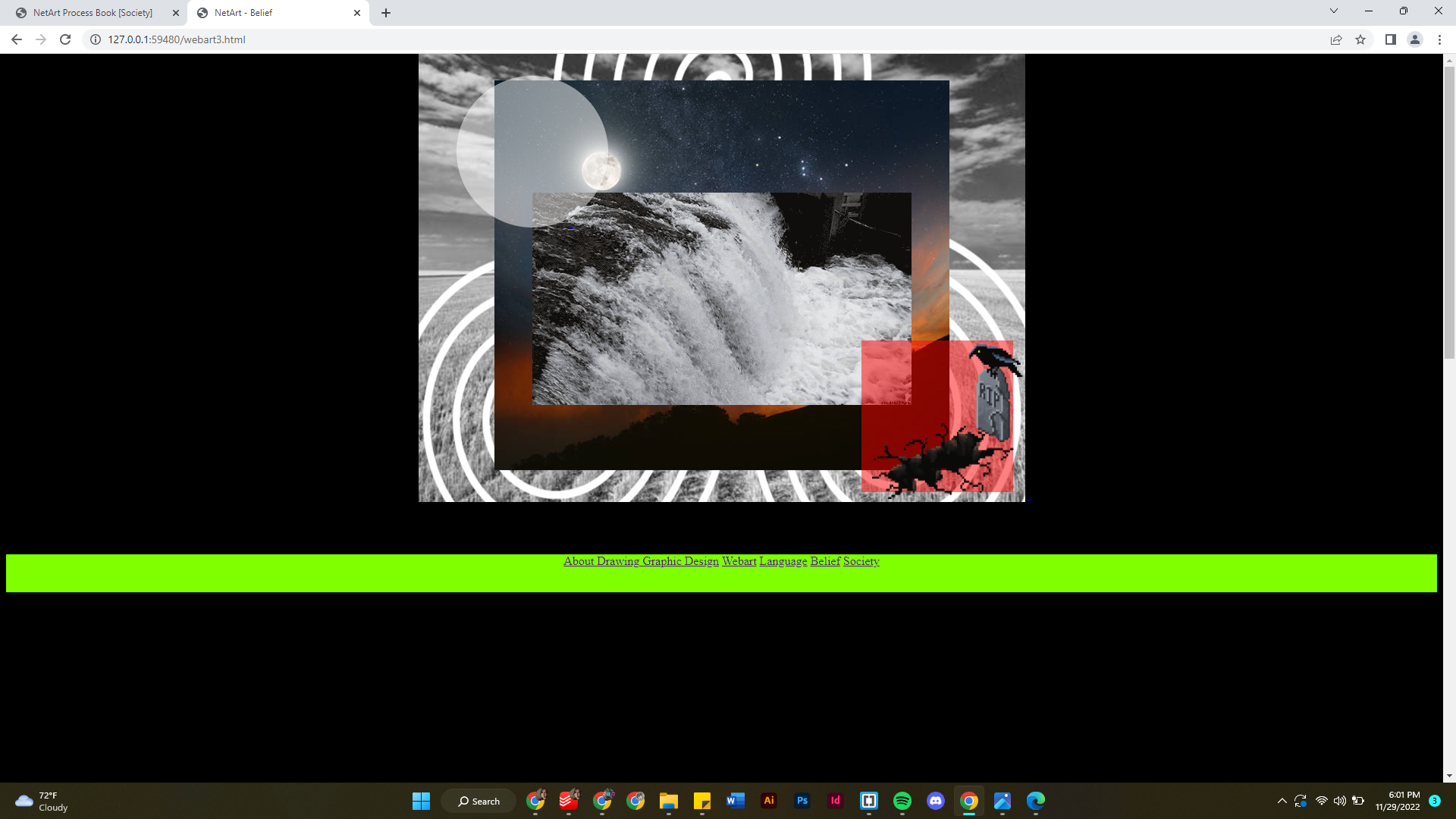On my word cloud, some ideas I wrote down for beliefs were belief systems that centered around our creation, our pupose, and the after life. My second NetArt piece explored these three major ideas. There are hidden clickable elements, inviting the viewer to look at things that are beyond this world.