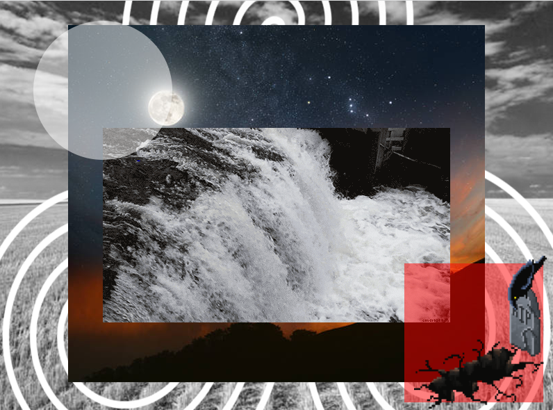 This was built using a diagonal composition, allowing the viwers eyes to travel across the page. The 'start' is the translucent white circle. It is whole and undamaged. Then there is a gif of a running waterfall. Many belief systems subscribe to the idea that there is an energy or force in everything, and I thought running water would be a great way to visually tie that idea in. It also gives a sense of motion to the collage.
